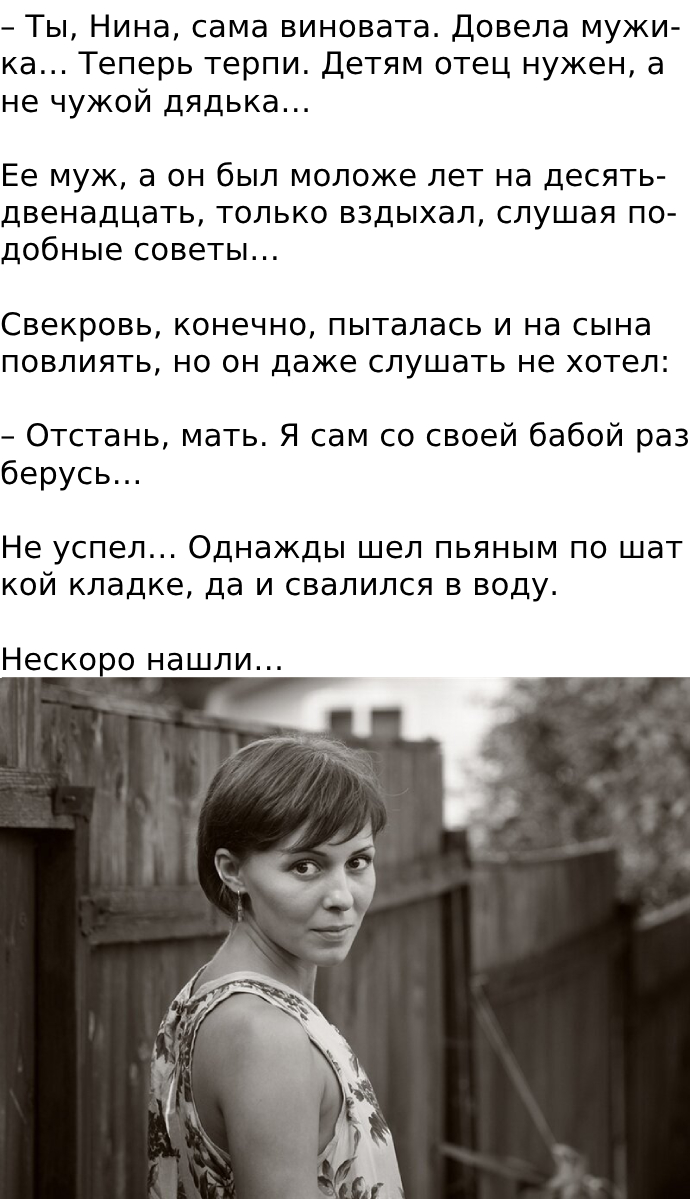 – Ты, Нина, сама виновата. Довела мужика… Теперь терпи. Детям отец нужен, а не чужой дядька…
