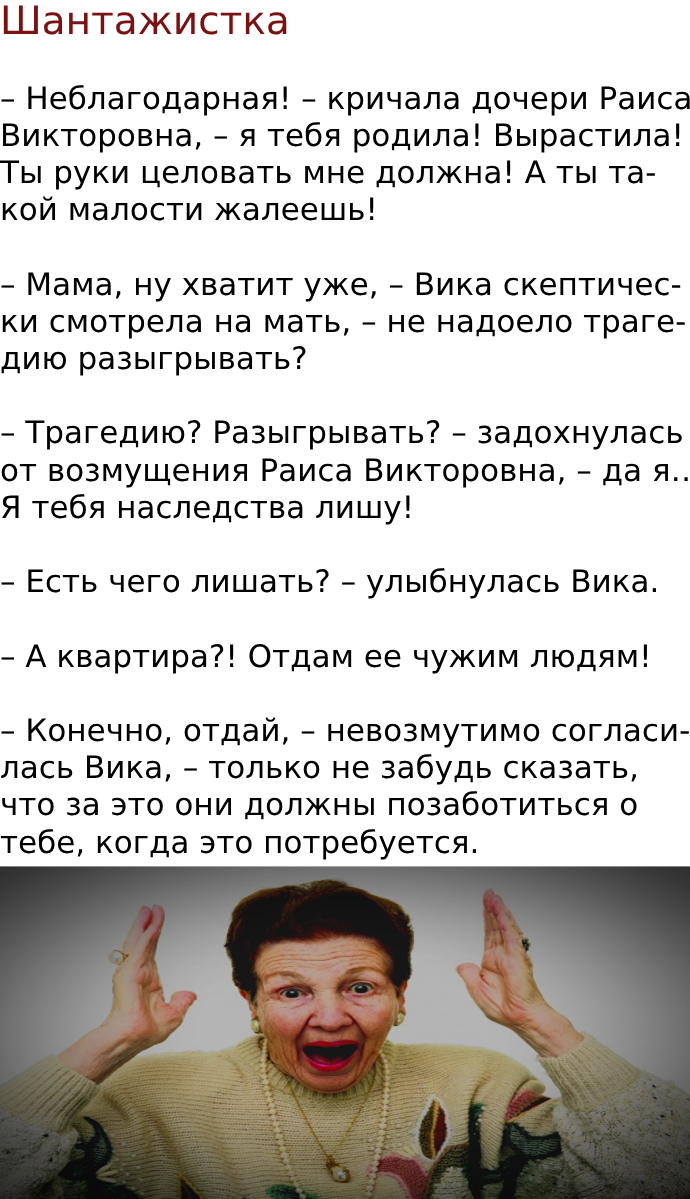 Ну, а поскольку, самой Вике это в голову не приходит, она, Раиса Викторовна, объяснит ей, как правильно жить! И как нужно благодарить родительницу…