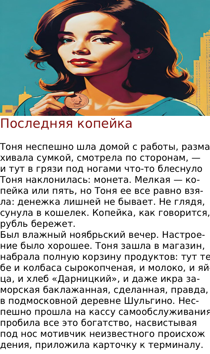— Ну, одна-то копейка у меня есть, — усмехнулась Тоня, — последняя, на ней так и написано.